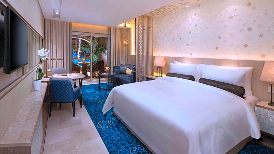 The Grand Pool Suite features a spacious living and dining area, coffee table, separate master bedroom with spacious bed . Its decor reflects the Mediterranean warmth, a spacious private terrace offer direct access to the pool with massage water jets. The bathroom offers a bath, bathrobe and complimentary toiletries.